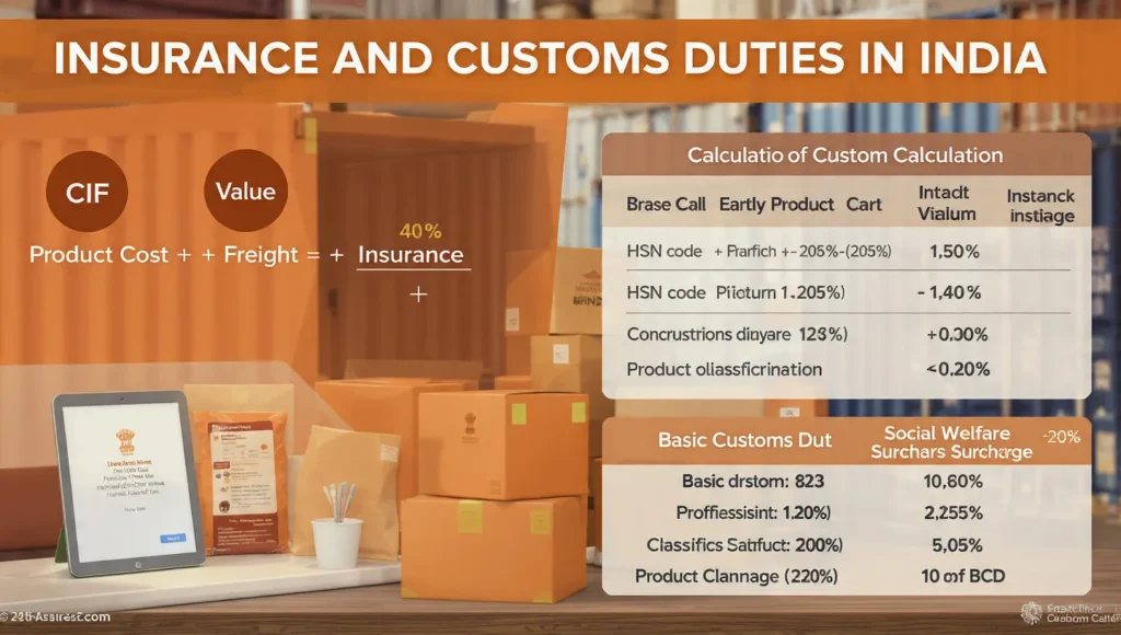 Visual flow of landed cost calculation in India showing product cost, freight, insurance, customs duty, and taxes for imported electronics