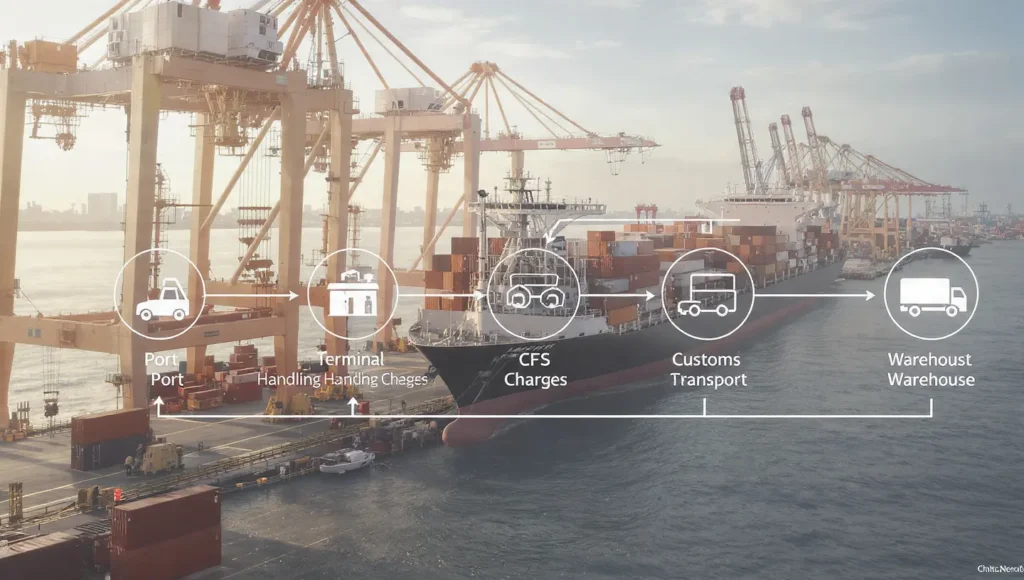 Illustration showing landed cost breakdown in Indian import business including product price, freight, customs duty, IGST, port charges, and warehouse delivery